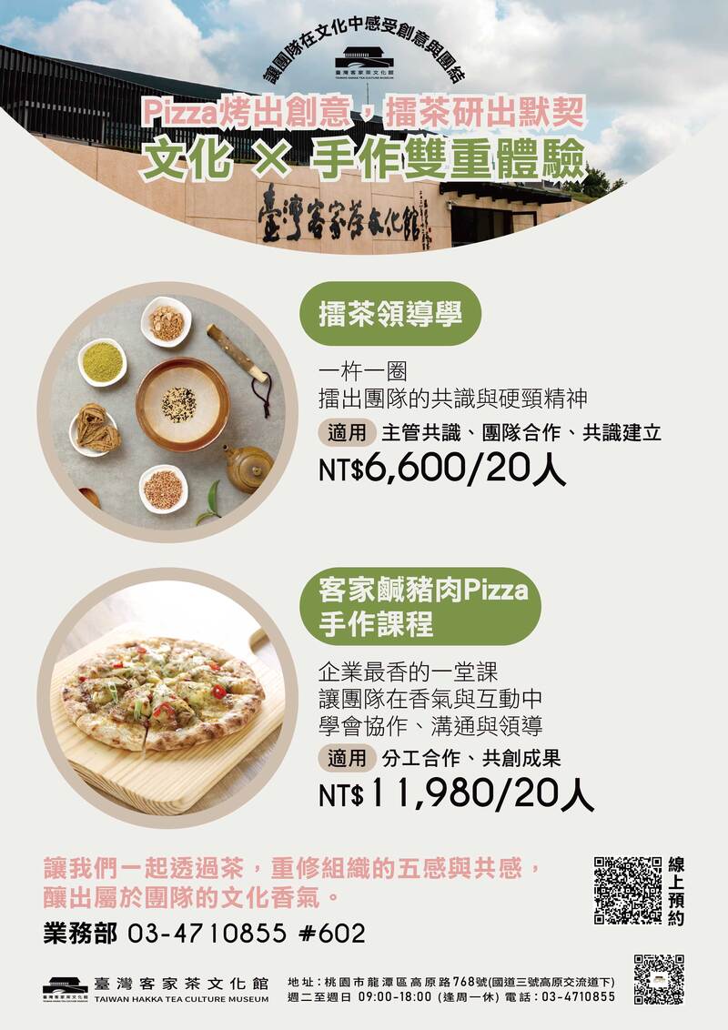在臺灣客家茶文化館,透過「擂茶領導學 × 客家鹹豬肉Pizza手作課」打造企業團隊默契與創意。體驗文化共識、分工合作,凝聚團隊領導力的五感課程。