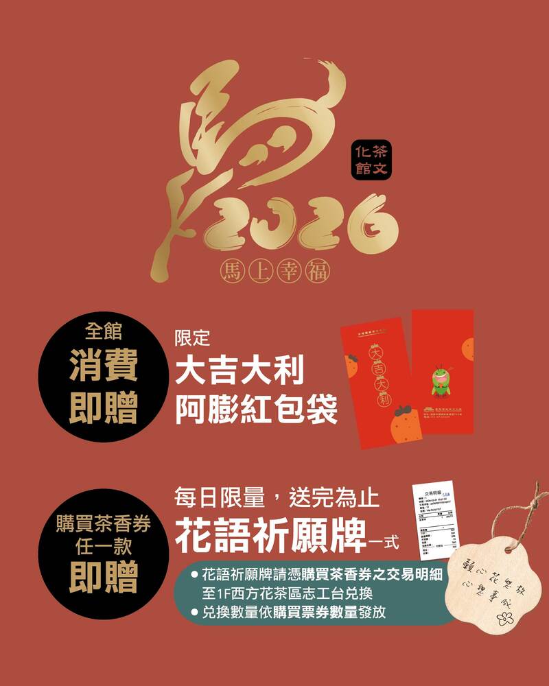 ※ 花語祈願牌限定於現場購買茶香券之消費者,請憑當日交易明細至1F西方花茶區志工台兌換,兌換數量依照購買之茶香券券數發放。(購買5張茶香券,則發放5個花語祈願牌)
