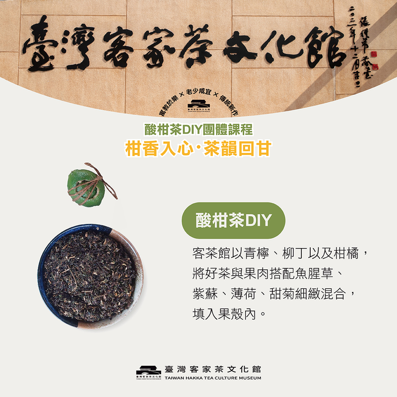 結合客家傳統工藝與現代手作樂趣的酸柑茶DIY體驗,帶你認識客家惜物文化、虎頭柑的轉化故事,一起完成屬於自己的酸柑茶。