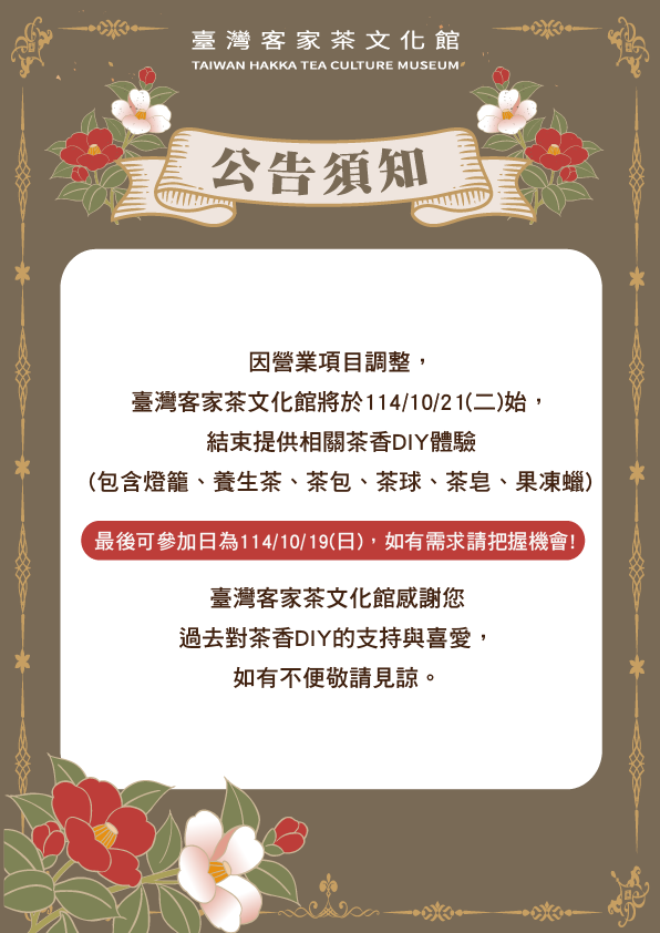 因營業項目調整,臺灣客家茶文化館將於114/10/21(二)始,結束提供相關茶香DIY體驗(包含燈籠、養生茶、茶包、茶球、茶皂、果凍蠟體驗)。