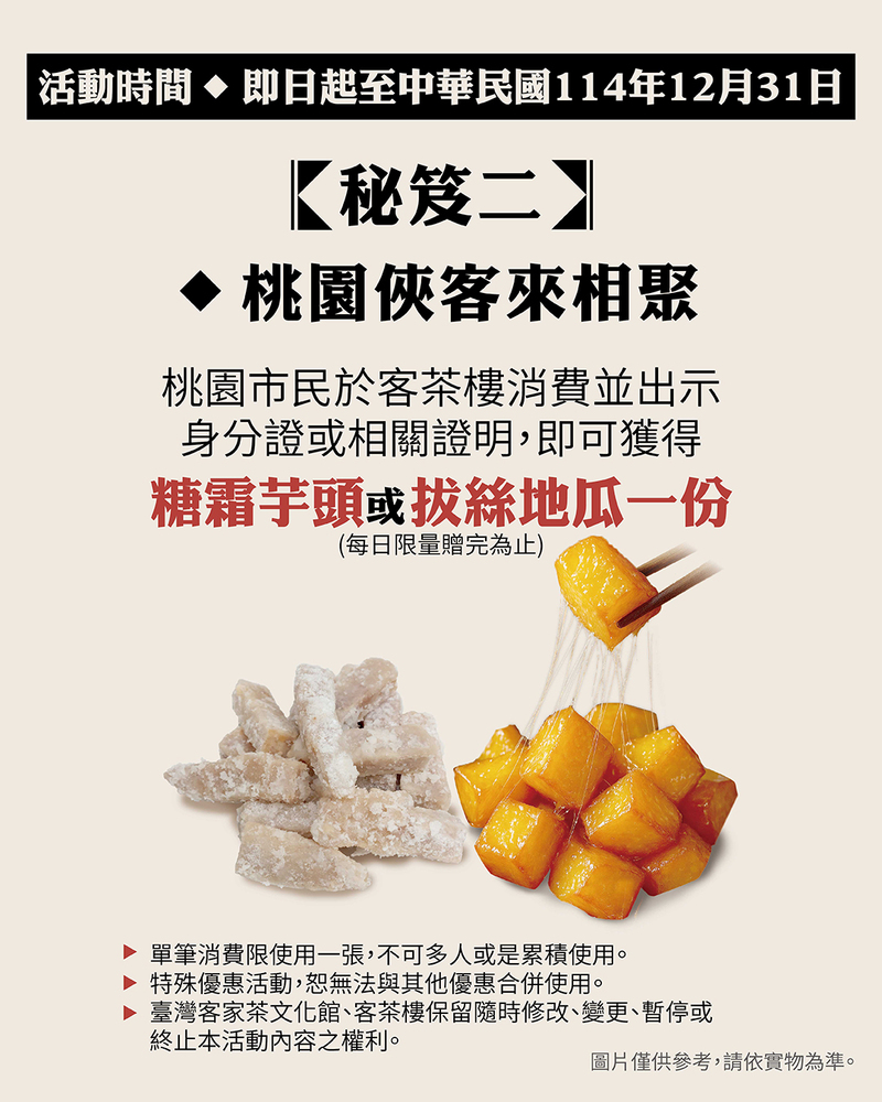 凡設籍於龍潭區的居民,持身分證至本館客茶樓中餐廳以及福爾摩沙茶館,即享餐飲九折優惠。 (本活動不包含商店街小吃攤販、阿膨茶屋櫃位、瓦立特披薩西餐廳)